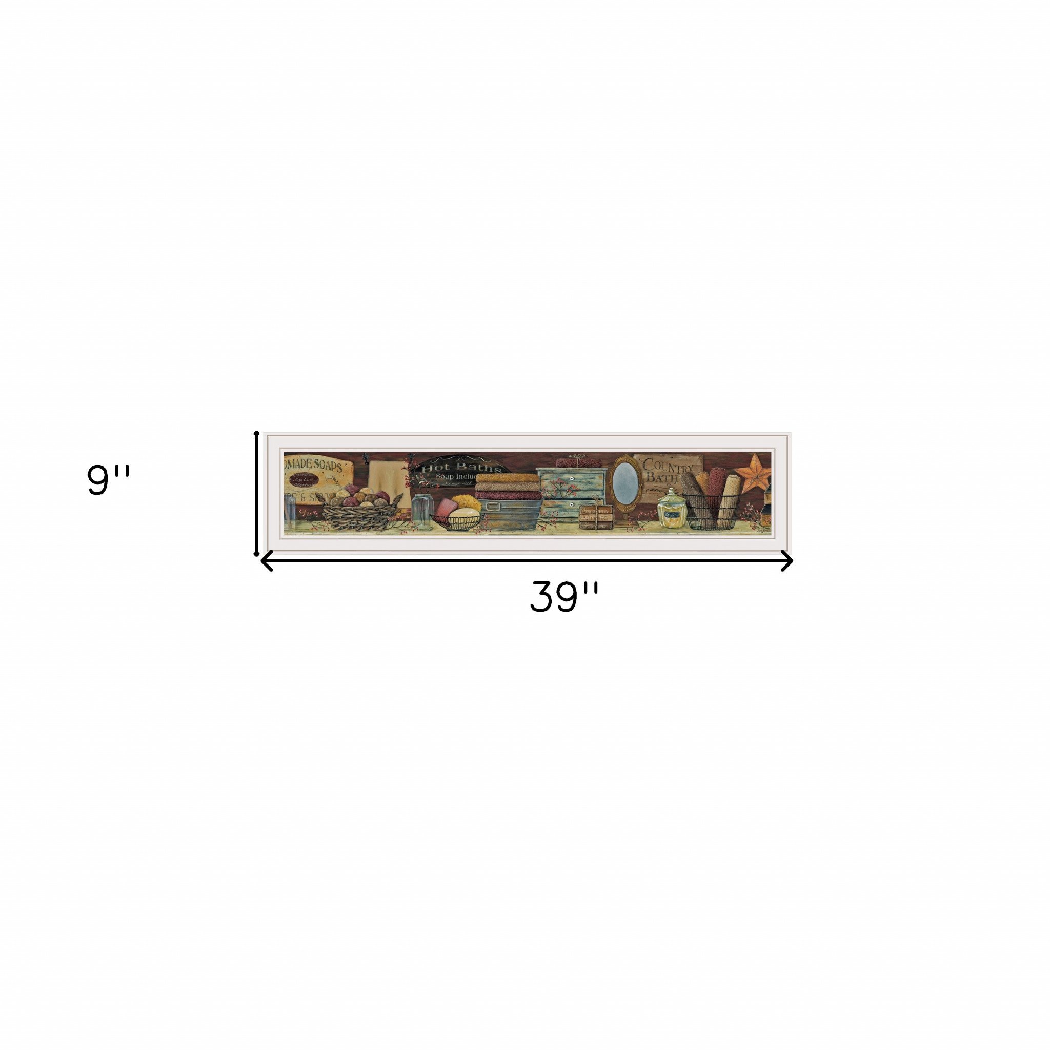 Bring some sizzle to your space with this eye-catching country bath shelf 2 white framed print bathroom wall art. This print is a visual artistic expression that allows you to decorate your space in style. Reproduced for you on paper, this hanging decorative accent will be a trendy and fashionable way to dress your walls. Adding this hanging wall art to your space to make your room feel more finished and attractive. Instantly liven up your space with this art that brings color and dimension to your walls. 9-inch H x 39-inch W x 1-inch D