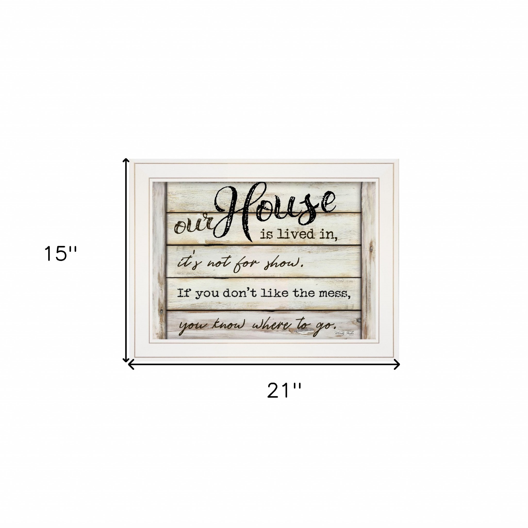 Bring some sizzle to your space with this eye-catching our house is lived in 2 white framed print wall art. This print is a visual artistic expression that allows you to decorate your space in style. Reproduced for you on paper, this hanging decorative accent will be a trendy and fashionable way to dress your walls. Hang on your wall to add some up to date fashion and decoration. Utilize this opportunity to create a focal point in the room with this fabulous wall decor option. 15-inch H x 21-inch W x 1-inch D