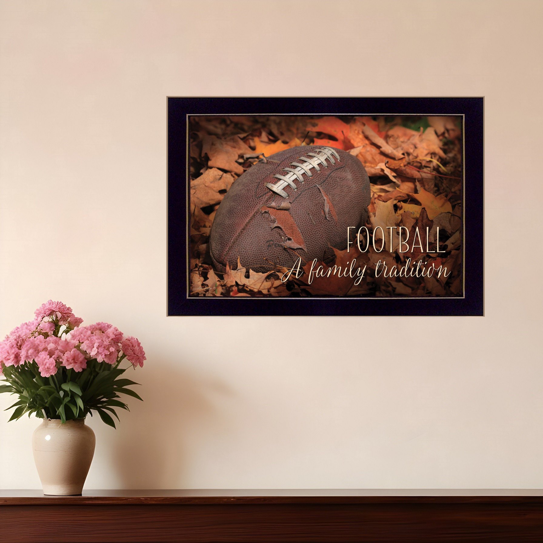 The football a family tradition black framed print wall art is the perfect decorative accessory for your home. This print is a visual artistic expression that allows you to decorate your space in style. Reproduced for you on paper, this hanging decorative accent will be a trendy and fashionable way to dress your walls. Hang on your wall to add some up to date fashion and decoration. Utilize this opportunity to create a focal point in the room with this fabulous wall decor option. 14-inch H x 20-inch W x 1-inch D