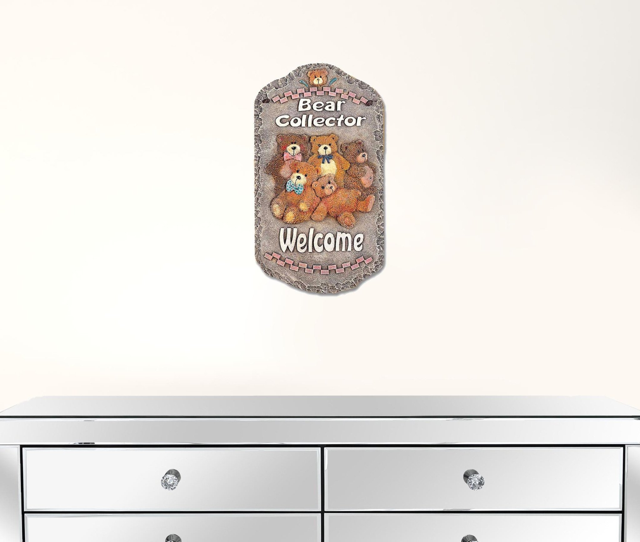 This Teddy Bear Collector Indoor Outdoor Resin Welcome Sign comes ready to hang and will be a greet way to great friends and family as the approach your home. The adorable design features beloved teddies. Made of sturdy polyresin this plaque can be used either indoors or outdoors. 13" x 7.75" x 1"