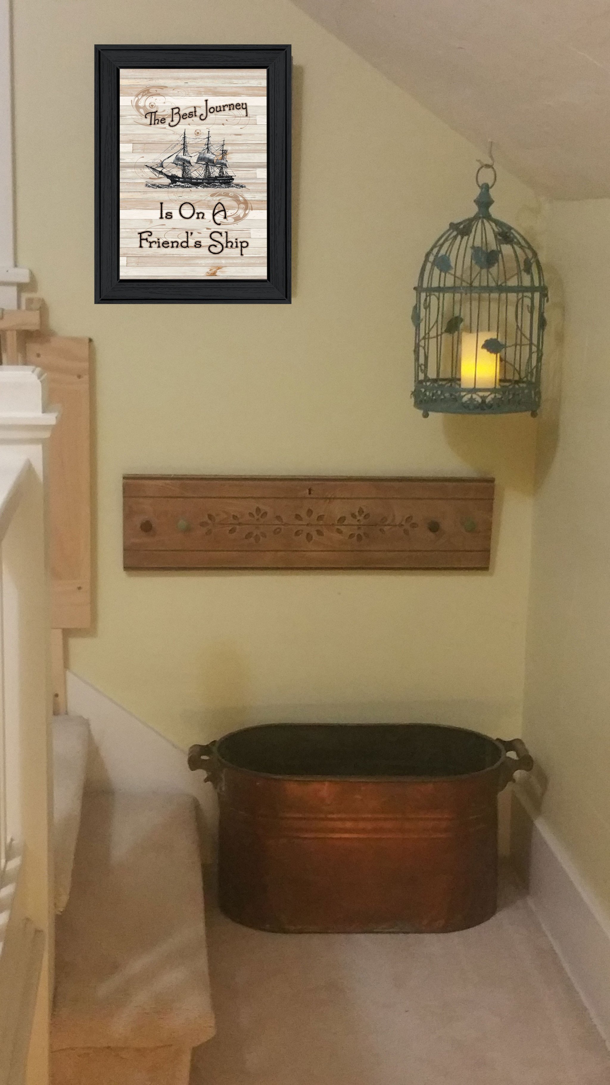 The friendship journey 1 black framed print wall art is the perfect decorative accessory for your home. This transportation inspired wall art features a ship icon and will bring a refreshing look and perspective to your walls. This print is a visual artistic expression that allows you to decorate your space in style. Reproduced for you on paper, this hanging decorative accent will be a trendy and fashionable way to dress your walls. Adding this hanging wall art to your space to make your room feel more finished and attractive. Utilize this opportunity to create a focal point in the room with this fabulous wall decor option. 15-inch H x 11-inch W x 1-inch D