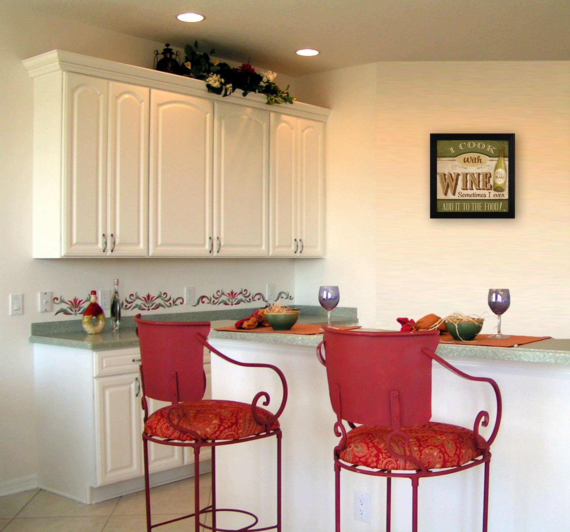 Unique and decorative, this i cook with wine black framed print kitchen wall art will leave a lasting impression. This print is a visual artistic expression that allows you to decorate your space in style. Reproduced for you on paper, this hanging decorative accent will be a trendy and fashionable way to dress your walls. Adding this hanging wall art to your space to make your room feel more finished and attractive. Utilize this opportunity to create a focal point in the room with this fabulous wall decor option. 14-inch H x 14-inch W x 1-inch D